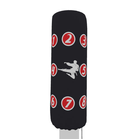 Stretchy spandex bag sleeve simply slips over the top of your punching bag and ties at the base.